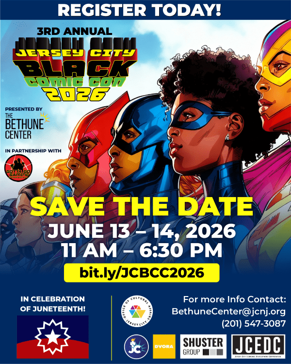 Save the date for the 3rd Annual Jersey City Black Comic Con on June 13–14, 2026, from 11 AM to 6:30 PM. Presented by the Bethune Center, this two-day event celebrates Black culture, comics, cosplay, and creativity in honor of Juneteenth, featuring artists, vendors, and community programming for all ages. Organized by the City of Jersey City Office of Cultural Affairs and JCEDC.